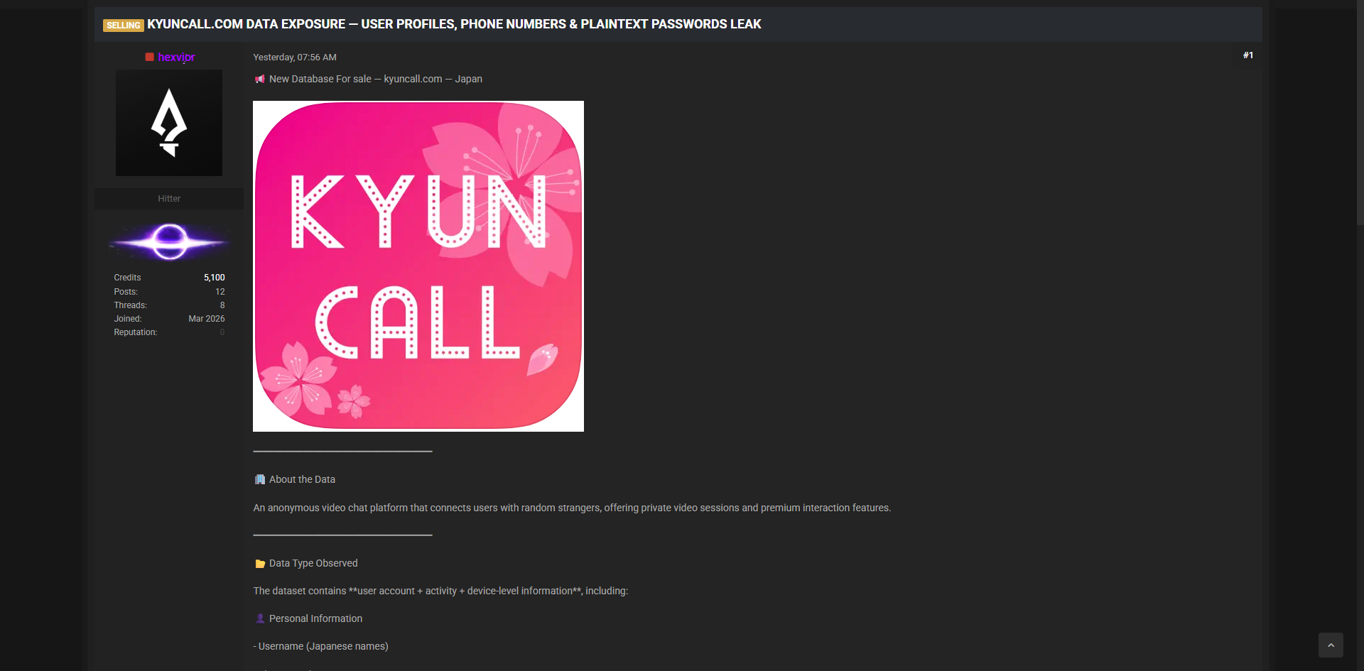 零零信安暗网新闻 | 日本KyunCall匿名视频聊天平台用户资料与明文密码泄露