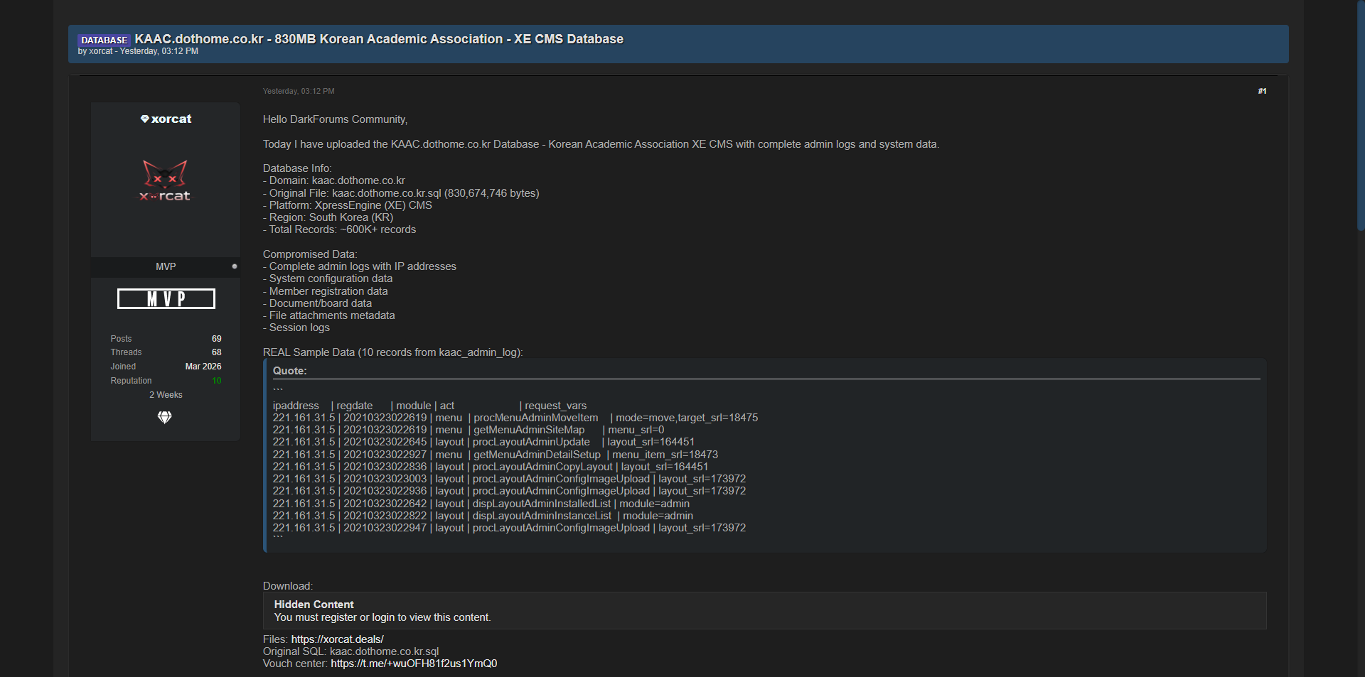 零零信安暗网新闻 | 韩国KAAC学术协会XE CMS系统830MB数据库泄露