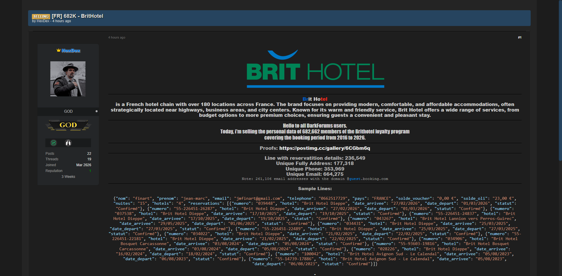 黑客论坛出售法国BritHotel连锁酒店忠诚会员程序完整数据库,共682,662条记录,覆盖2016至2026年预订数据,包含完整姓名、邮箱地址、电话号码、预订详情(酒店、入住日期、离店日期、状态、房间号等)、支付信息及其他会员资料。
