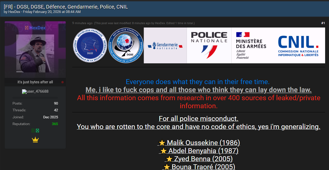 威胁行为者宣称,已整合并泄露法国多家核心情报与安全机构人员的个人数据,涉事机构涵盖法国国内安全总局(DGSI)、对外安全总局(DGSE)、国家宪兵队(Gendarmerie Nationale)、国家警察总局(Police Nationale)、国防部(Ministère des Armées)及国家信息与自由委员会(CNIL)。此次泄露数据据称来源于400余个泄露或私人数据库,行为者额外披露了86名CNIL员工的相关数据作为“附加内容”,并暗示后续将发布CNIL“已删除”数据的恢复内容。