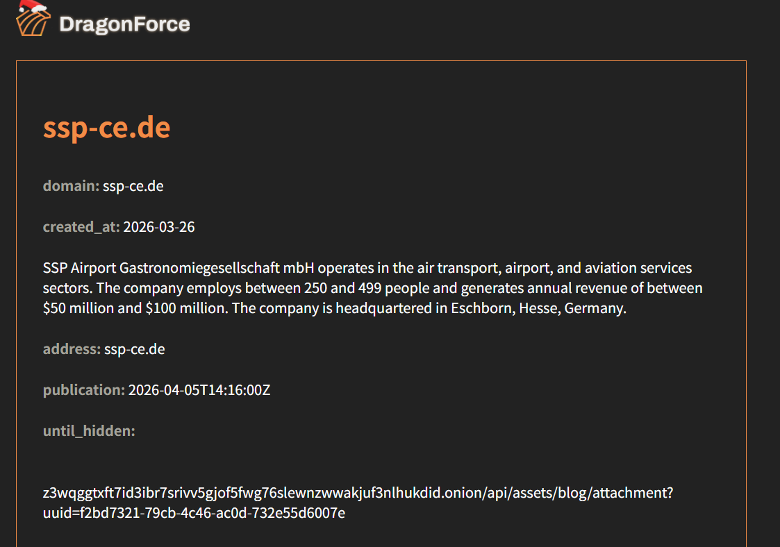 威胁行为者据称在黑客论坛上发布了德国机场餐饮公司 ssp-ce.de(SSP Airport Gastronomiegesellschaft mbH)的详细企业信息及附件,将其列为勒索软件攻击受害者。泄露内容包括公司域名、创建日期、业务描述、员工规模、年营收范围、总部位置。