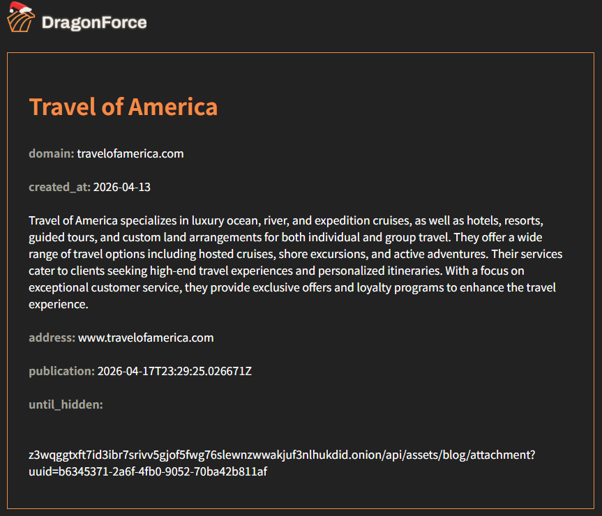 DragonForce曝光美国Travel of America完整公司情报记录,该公司专注于奢侈海洋、河流及探险邮轮服务,同时提供高端酒店、度假村、导游团及定制陆地旅行安排,包含托管邮轮、岸上观光、冒险活动等高品质旅行产品及个性化行程设计。