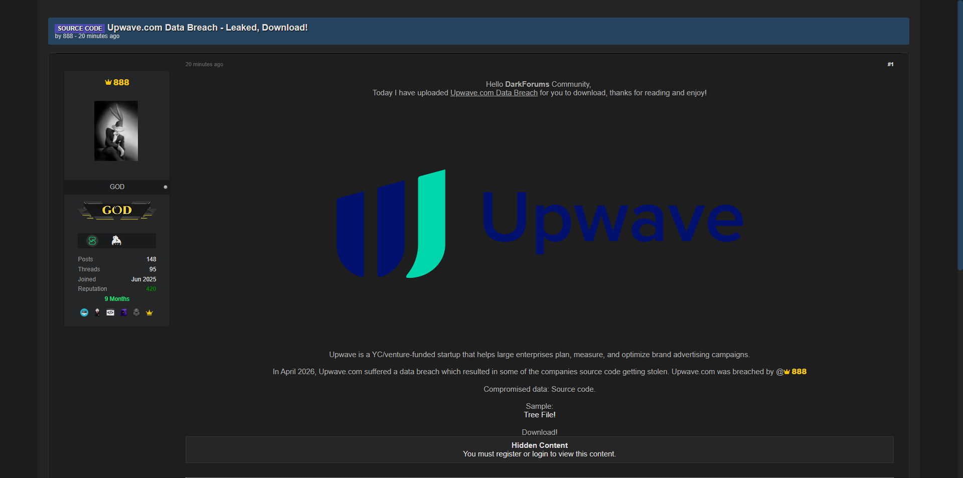 黑客论坛上曝光了美国Upwave.com(YC风险投资支持的品牌广告优化平台)的源代码泄露,包含网站服务器文件、数据库结构、业务ERP应用数据、微服务后端文件夹、备份目录以及用户档案等核心源代码。