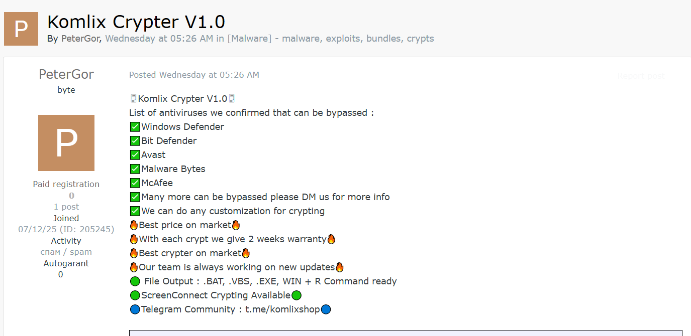 2026年2月,一位威胁行为者在地下恶意软件交易渠道发布了Komlix Crypter V1.0的销售帖子。该工具宣称是一种高级文件加密器(crypter),专门设计用于规避主流反病毒软件的检测,常被用于打包和隐藏恶意负载(如RAT、stealer、ransomware等)。卖家声称该版本经过实际测试,可有效绕过多种知名杀软,并提供自定义加密服务和短期保修。