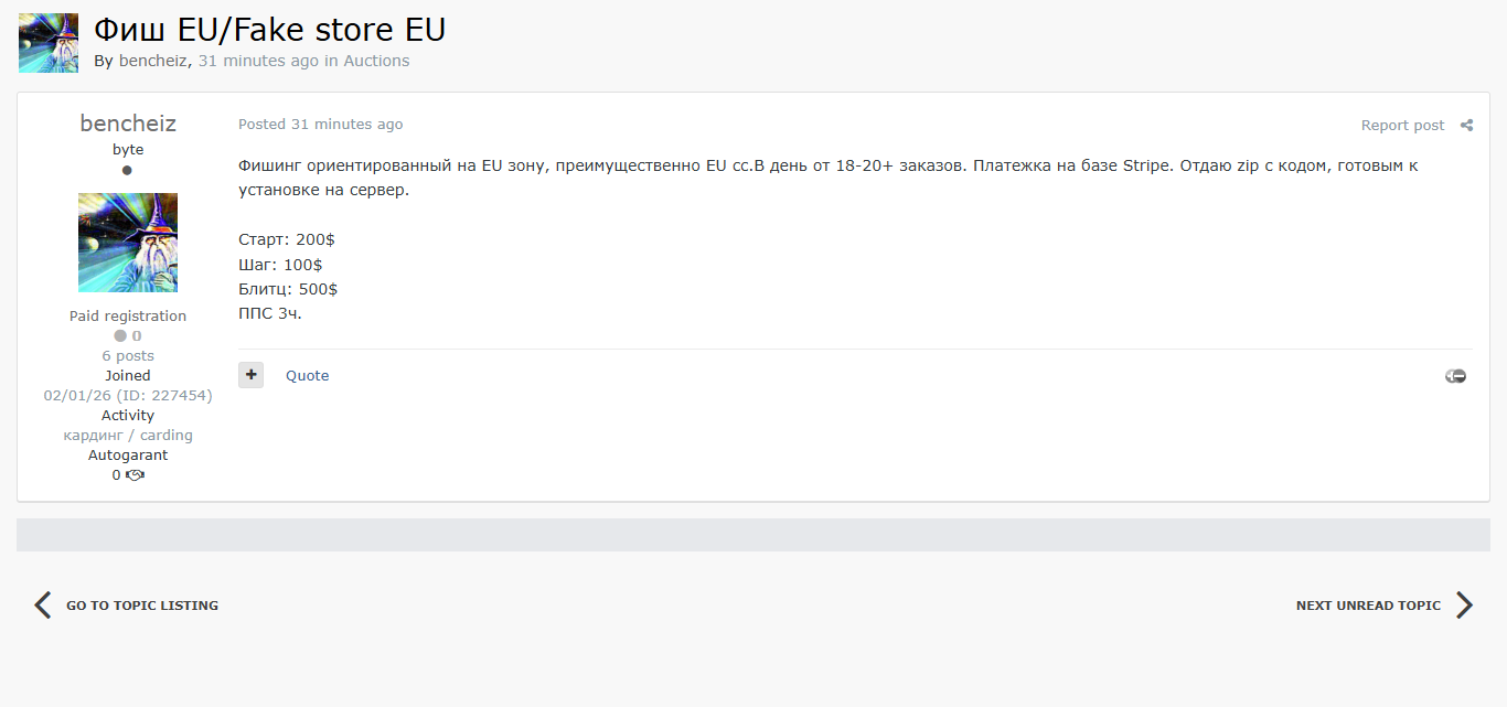 黑客论坛出售针对欧盟地区的钓鱼套件(Fake Store EU),主要面向欧盟用户,平均每天可收到18-20+个订单,支持Stripe支付系统,可直接交付ZIP源码包并提供安装支持。