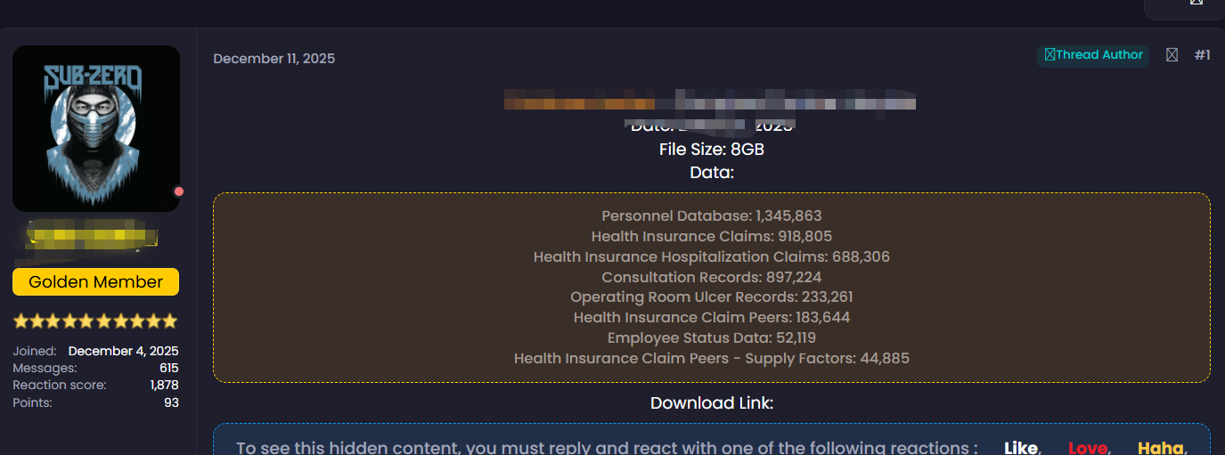 黑客论坛曝光台湾某基督教医院完整数据库,文件大小达8GB,包含医院多个核心系统的数据记录。