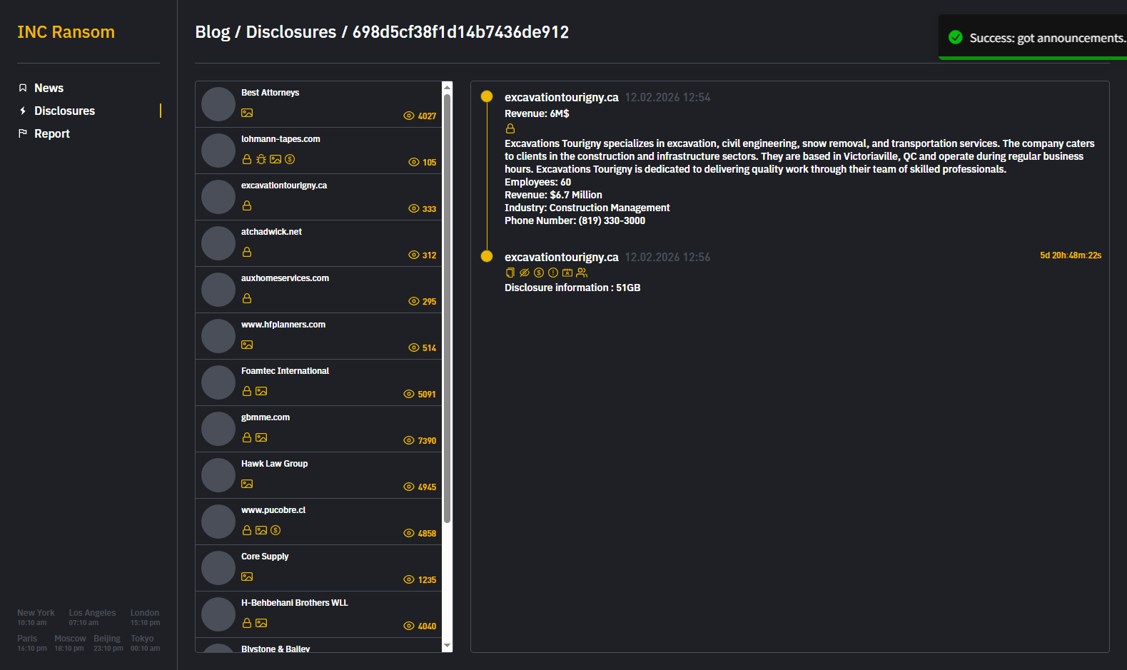 INC 勒索软件团伙宣称入侵了加拿大Excavations Tourigny,总部位于魁北克省维多利亚维尔,主营建筑与基建领域的土方开挖、土木工程、除雪及运输服务。该团伙宣称窃取的数据量为51GB