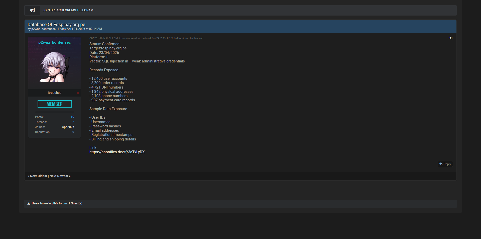 黑客论坛曝光秘鲁Fospibay.org.pe网站完整数据库,通过SQL注入+弱管理凭证入侵,共泄露1.24万用户账号及订单、身份证、地址、电话、支付卡等敏感记录。