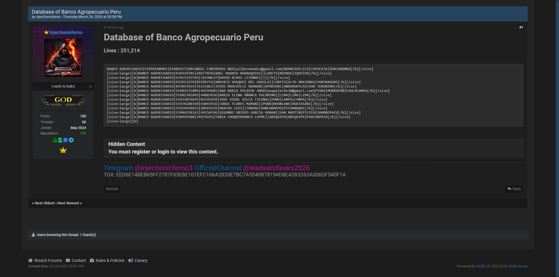 威胁行为者据称在黑客论坛上发布了秘鲁Banco Agropecuario(秘鲁农业银行)的完整客户数据库,共251,214条记录。这些数据包含大量客户个人信息和银行内部记录。
