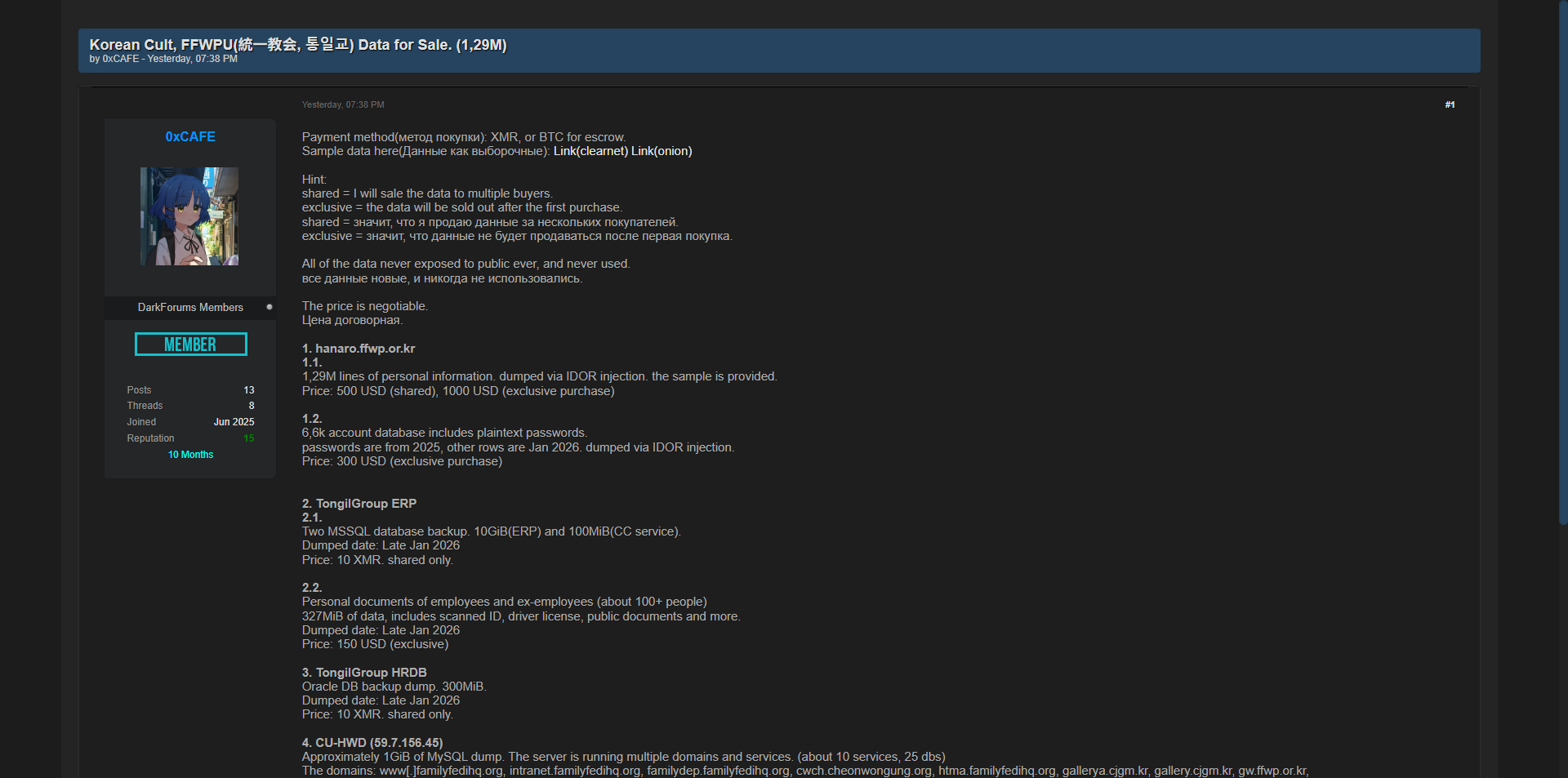 黑客论坛出售韩国统一教FFWPU(统一教会)hanaro.ffwp.or.kr网站完整数据库,共129万条个人记录(通过IDOR注入获取),同时包含TongilGroup集团ERP系统、HRDB及CU-HWD等多套内部数据库备份。