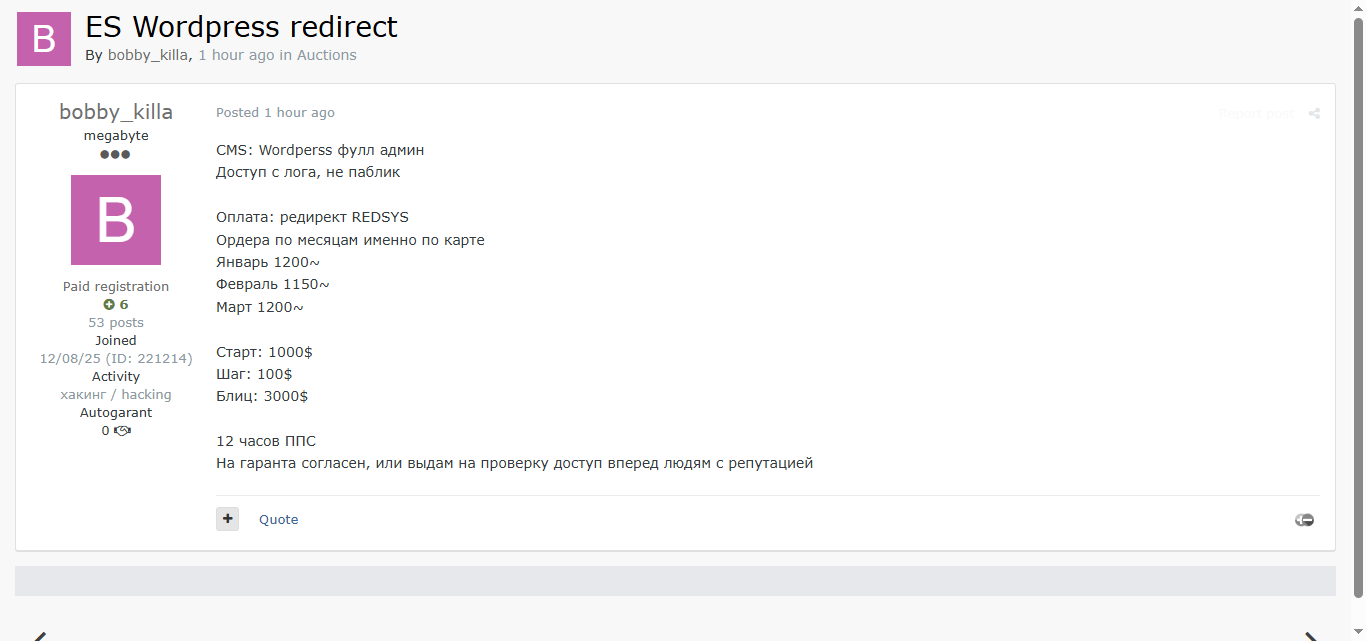 黑客论坛上拍卖西班牙某WordPress网站的完整管理员权限,可直接实现REDSYS支付重定向攻击,每月可处理约1150-1200美元订单,起拍价1000美元。