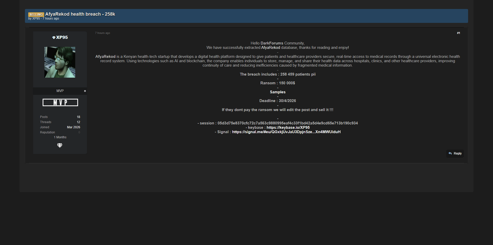 零零信安暗网新闻 | 肯尼亚AfyaRekod健康科技平台25.8万患者数据泄露