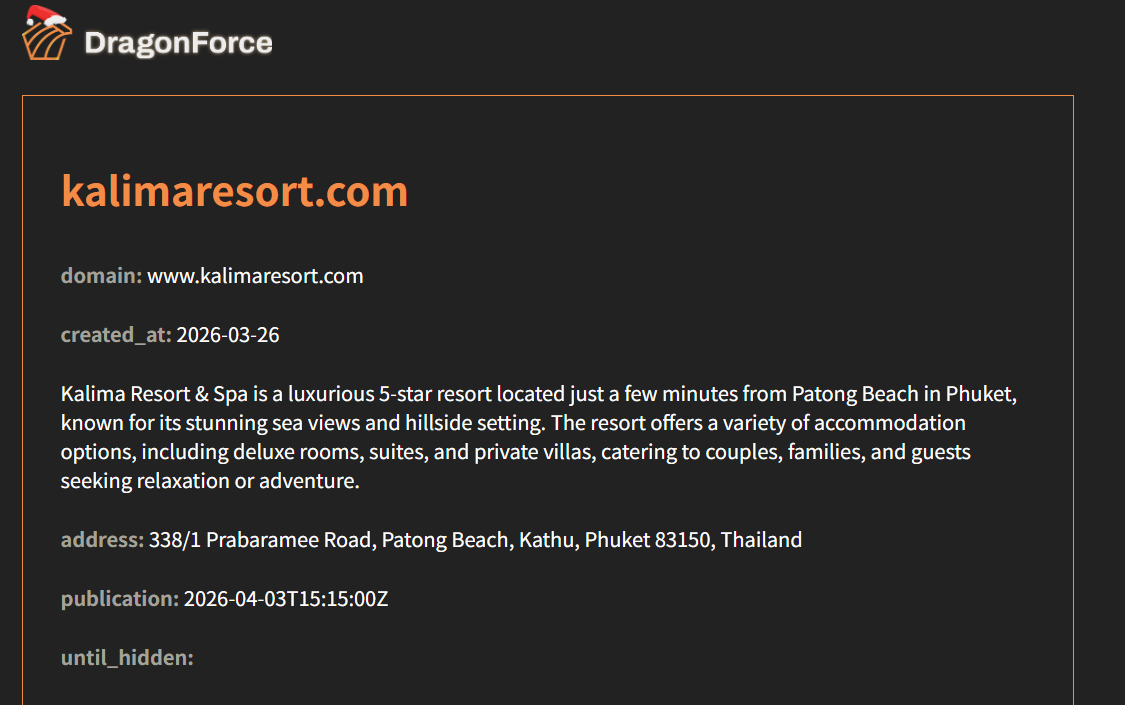 Kalima Resort & Spa(kalimaresort.com)是一家位于泰国普吉岛Patong Beach附近的豪华5星级度假村,距离海滩仅几分钟车程,以壮丽海景和山坡环境闻名,提供豪华客房、套房及私人别墅,服务于寻求放松或冒险的夫妇、家庭及游客。此次完整企业情报被威胁行为者DragonForce在暗网公开,可能面临后续数据泄露或网络攻击风险。