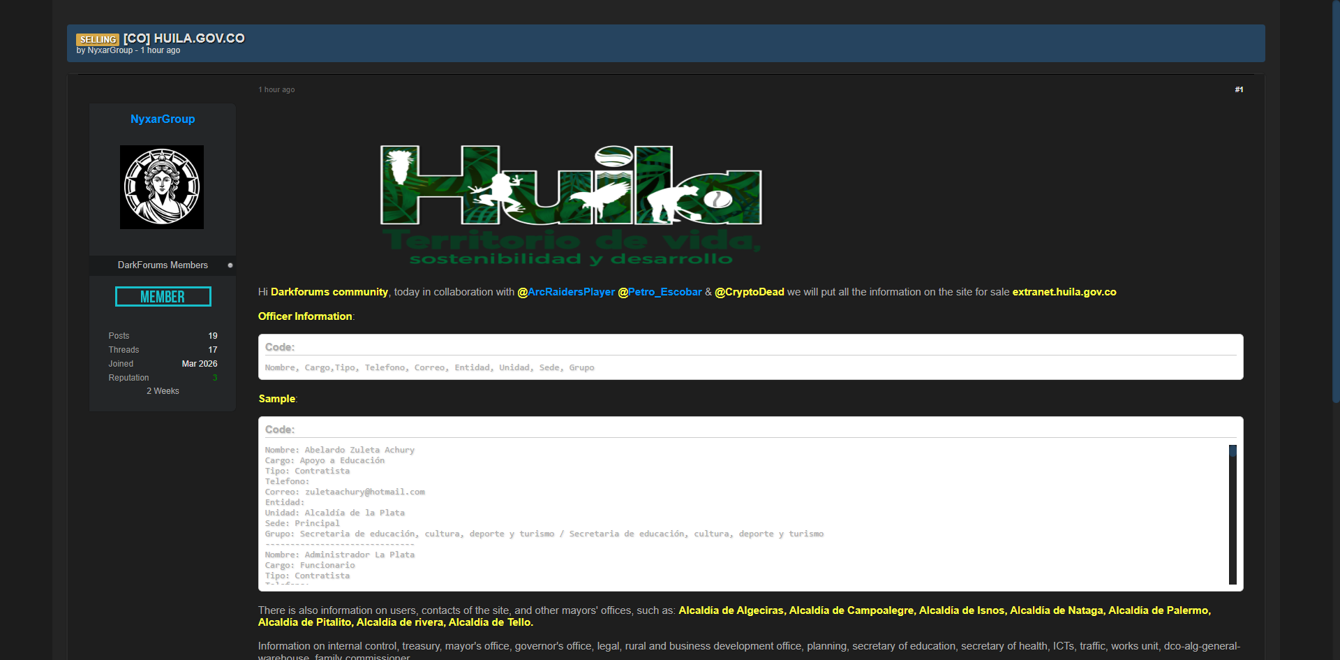 黑客论坛上出售哥伦比亚Huila省政府(huila.gov.co / extranet.huila.gov.co)的内部数据,包含大量政府官员姓名、职务、电话号码、邮箱地址、所属单位及多个市政厅的详细信息。
