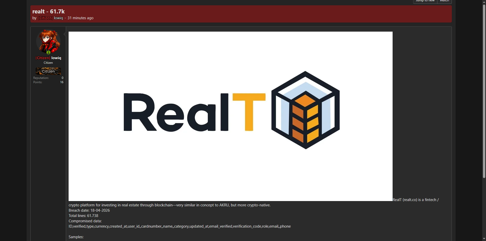 黑客论坛曝光区块链房地产投资平台RealT(realt.co)完整数据库,共61,738条记录,泄露了用户ID、姓名、邮箱、电话号码、银行卡号、验证代码、角色、创建/更新时间等敏感个人信息。