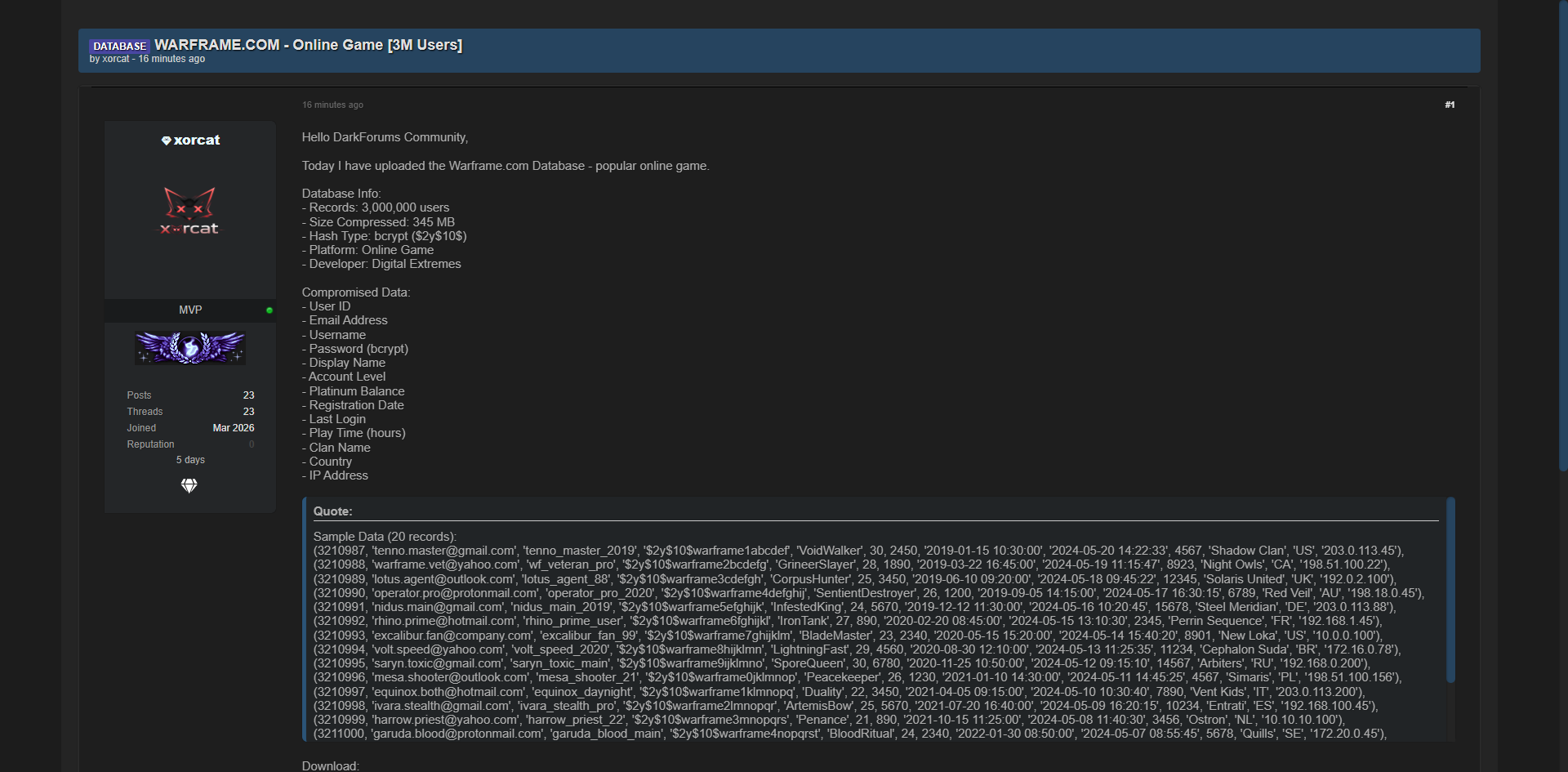 黑客论坛上曝光了知名科幻在线游戏Warframe.com的用户数据库,包含用户ID、电子邮件地址、用户名、bcrypt密码哈希、显示名称、账号等级、铂金余额、注册日期、最后登录时间、游戏时长、氏族名称、国家、IP地址等字段,共300万条用户记录。