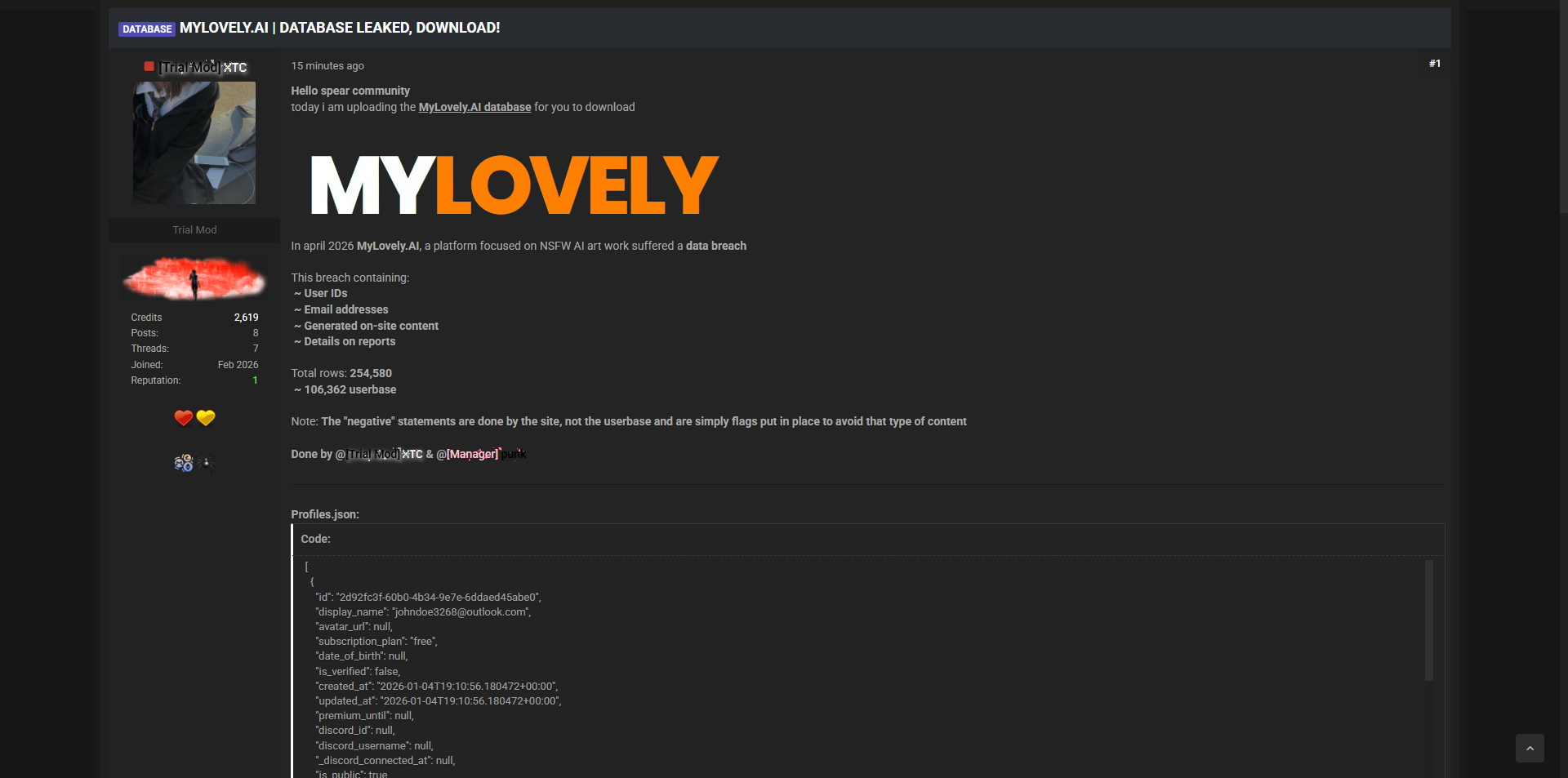 黑客论坛上曝光了MyLovely.AI(专注NSFW AI艺术生成平台)的完整数据库,包含用户ID、邮箱地址、显示名称、订阅计划、生成的NSFW内容以及报告详情等敏感信息,总记录数超25万条,涉及约10.6万用户。