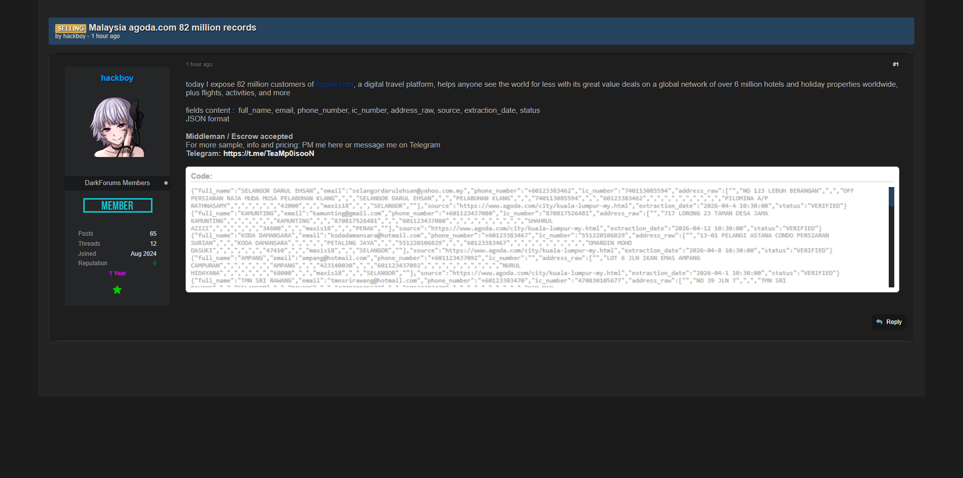 黑客论坛曝光全球知名旅行预订平台Agoda.com马来西亚用户数据库,共8200万条记录,包含大量用户完整姓名、邮箱、电话号码、身份证号码、详细地址等核心个人信息。