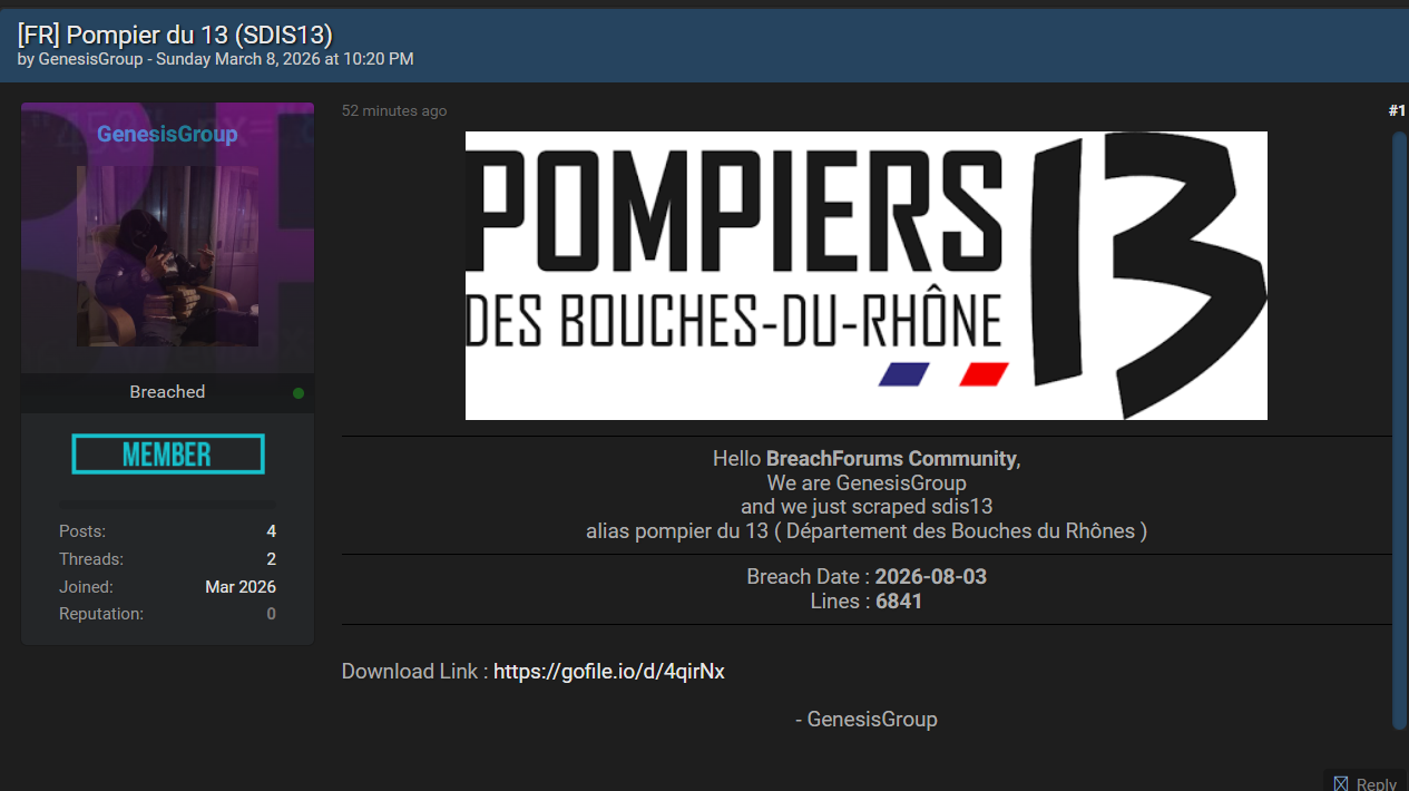 威胁行为者在黑客论坛上发布了针对法国Pompier du 13(SDIS13)的刮取数据声明,声称已成功获取该消防救援部门的数据并提供下载。该威胁行为者 GenesisGroup 主要从事欧洲公共机构数据泄露。该实体是SDIS13,是负责全省消防灭火、紧急救援、医疗急救和灾害应对的核心消防部门。