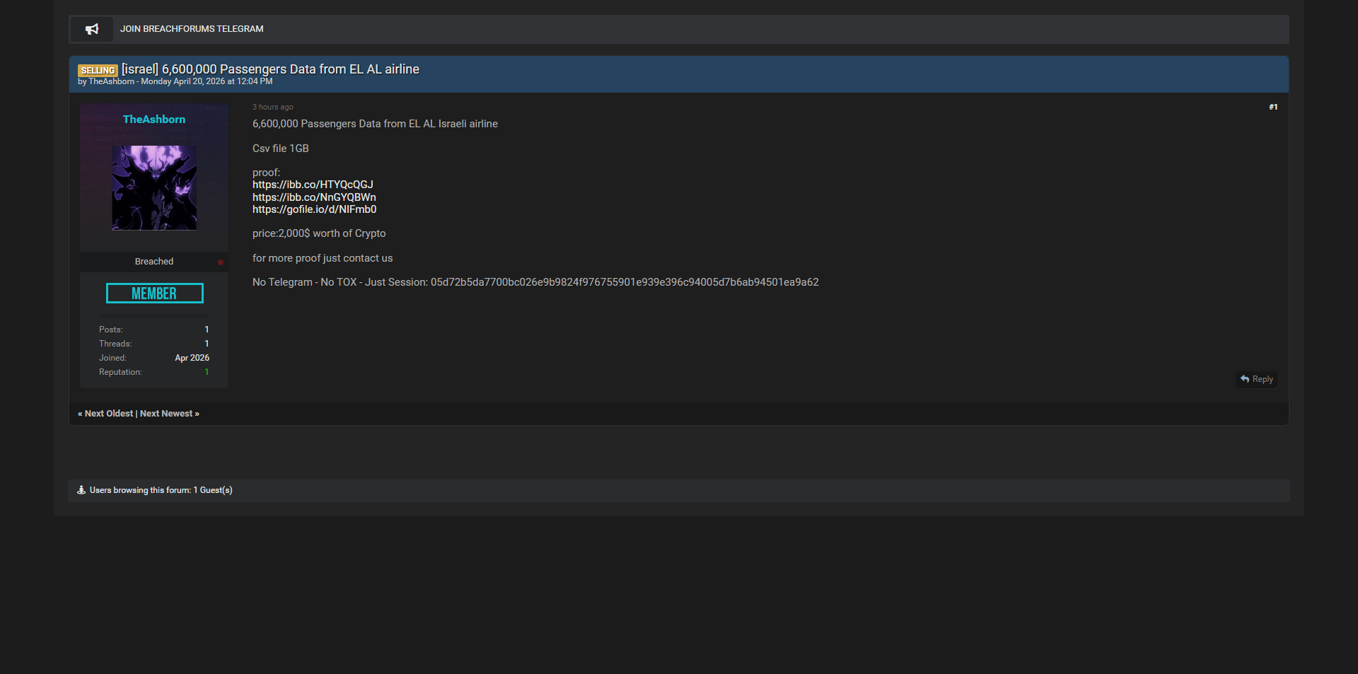 黑客论坛出售以色列国家航空公司EL AL完整乘客数据库,共660万条记录,CSV文件1GB,包含大量乘客个人信息。