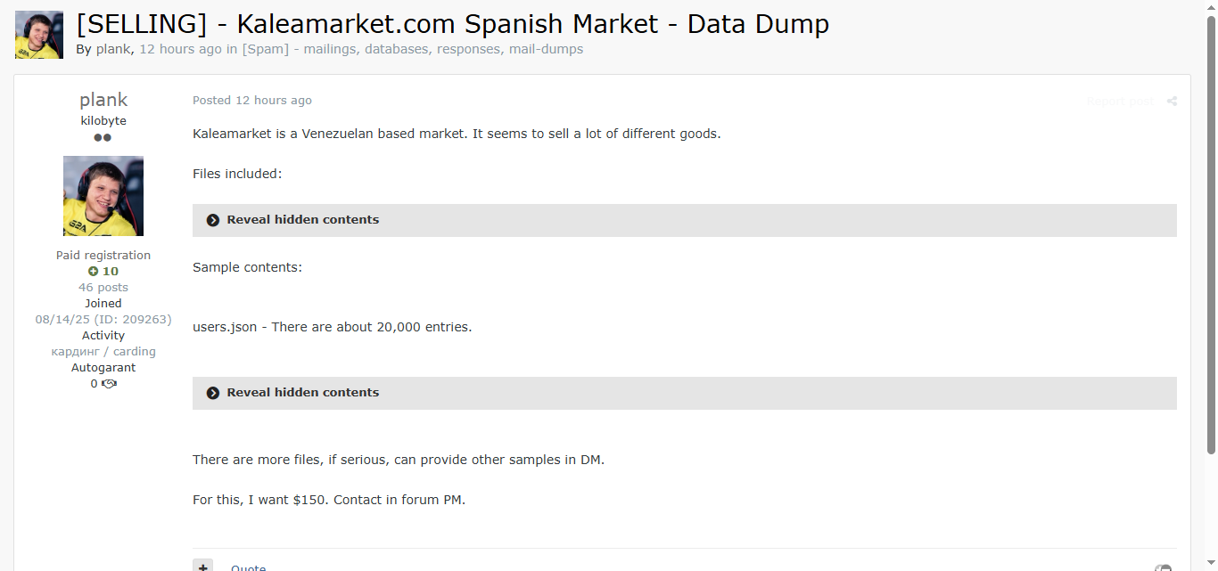黑客论坛上出售委内瑞拉在线市场Kaleamarket.com的完整数据转储,包含users.json文件(约2万条用户记录)以及其他内部数据文件。