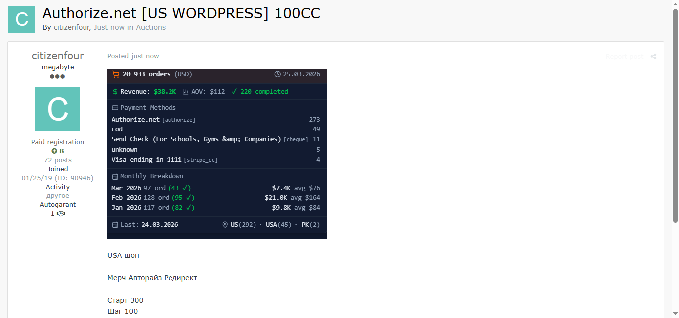黑客论坛上拍卖美国某WordPress网站的Authorize.net支付重定向完整权限,包含20,933条订单记录,总收入3.82万美元,平均订单价值112美元,已完成220笔订单,支持直接劫持支付流程。