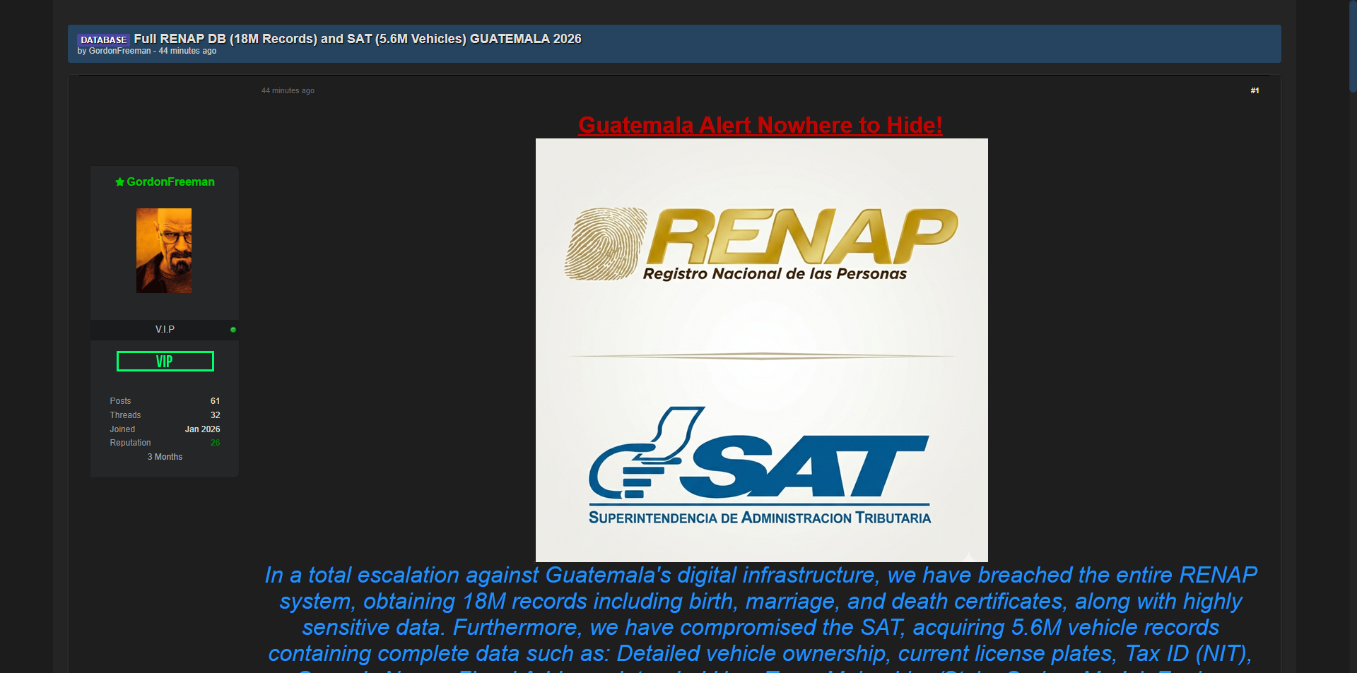 黑客论坛曝光危地马拉RENAP全国人口登记系统完整数据库,共1800万条记录,同时泄露SAT税务局560万条车辆数据,包含出生、婚姻、死亡证明、车辆所有权、当前车牌、纳税识别号(NIT)等高度敏感信息。