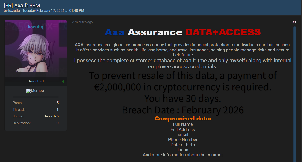 一名威胁行为者宣称持有法国AXA安盛(AXA France)的完整客户数据库及内部员工访问凭证,此次疑似数据泄露发生于2026年2月,包含超800万条记录;该行为者以阻止数据转售为要挟,索要200万欧元加密货币赎金,对企业数据安全、客户权益及运营安全构成严重威胁。