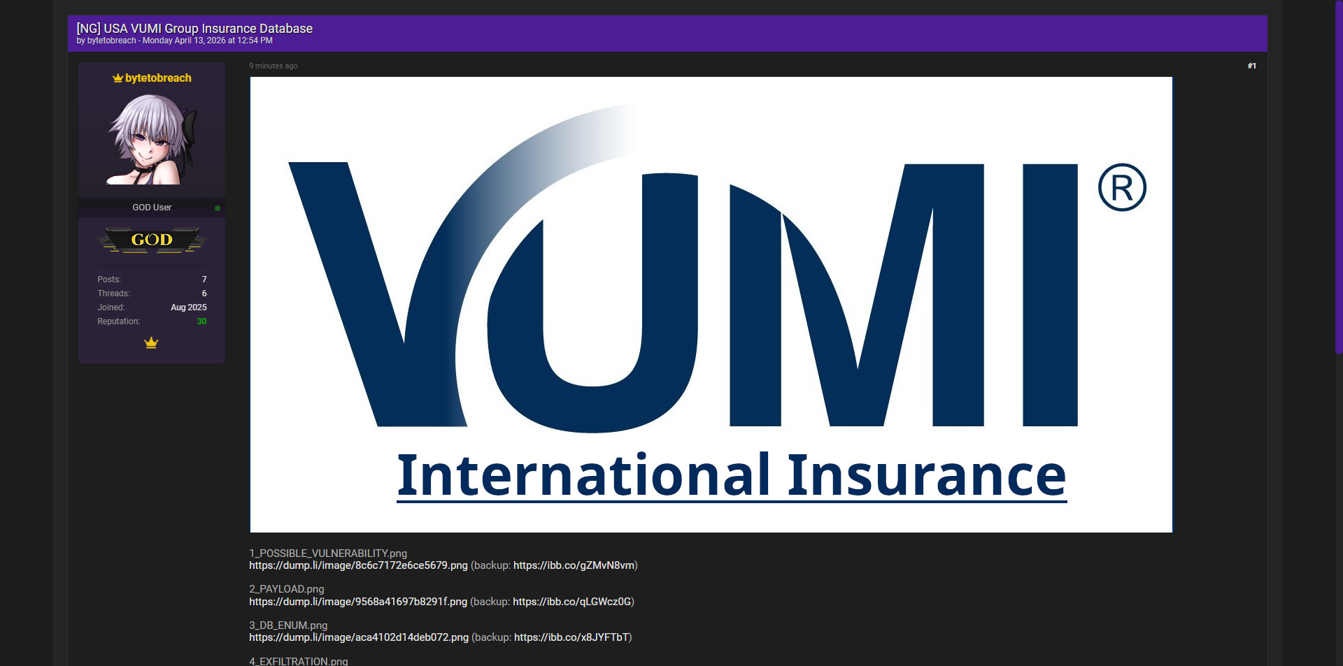 黑客论坛曝光美国VUMI Group(VUMI International Insurance)完整保险数据库,包含大量保险客户、理赔及内部业务核心数据。