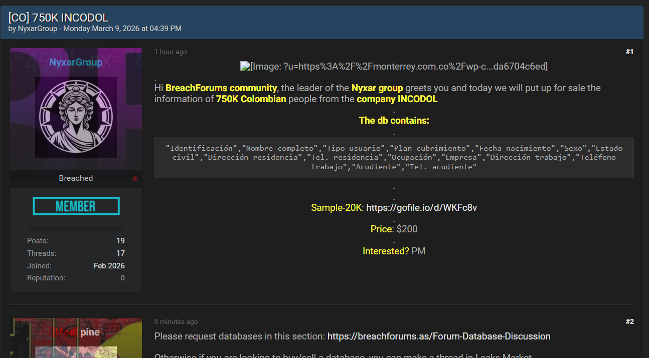 威胁行为者在黑客论坛上发布了针对哥伦比亚公司 INCODOL 的数据销售声明,声称拥有75万哥伦比亚人的个人信息并提供20K样本。该威胁行为者 NyxarGroup 主要从事拉美国家数据售卖。该实体是INCODOL,属于哥伦比亚一家专注于医疗保险与健康覆盖计划的公司。