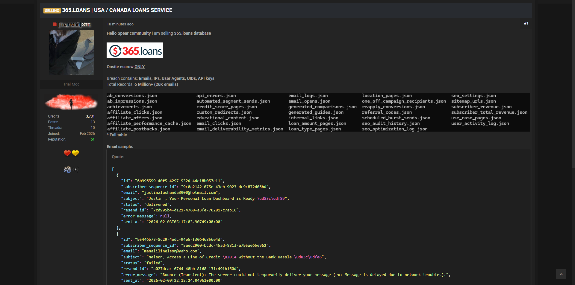 黑客论坛出售美国/加拿大365.loans贷款服务平台完整数据库,包含600万+记录及2.6万邮箱信息,泄露大量运营日志与技术数据。