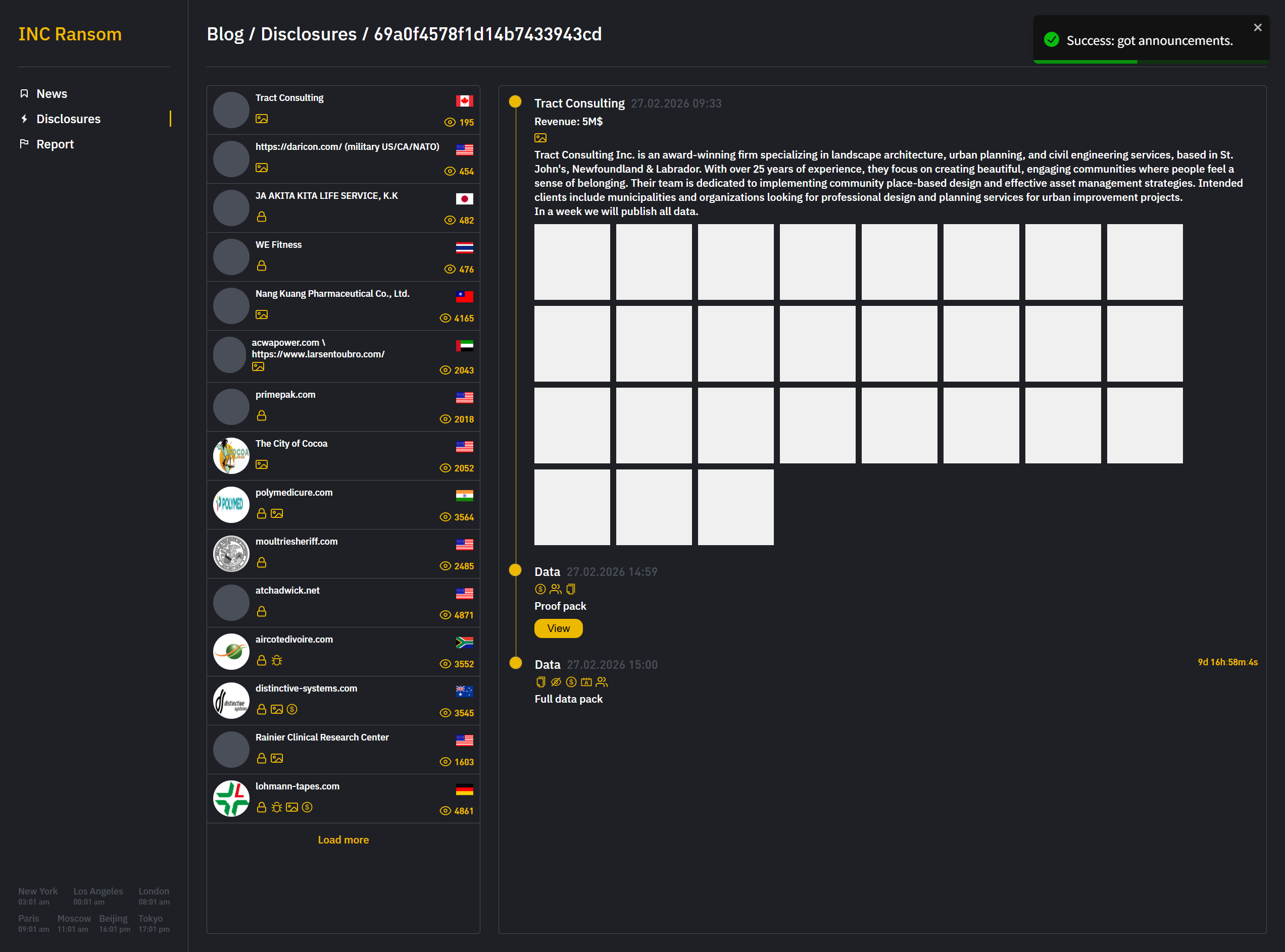 位于纽芬兰与拉布拉多省圣约翰市的 Tract Consulting Inc.于2026年2月27日在暗网被添加为受害者,估计攻击发生在2月26日前后。该公司是一家获奖景观建筑、城市规划及土木工程服务商,拥有超25年经验,主要服务市政当局及城市改善项目组织,已服务超100个市政客户。攻击者威胁在一周内公开发布全部窃取数据,目前已在泄露页面上传部分样本。
