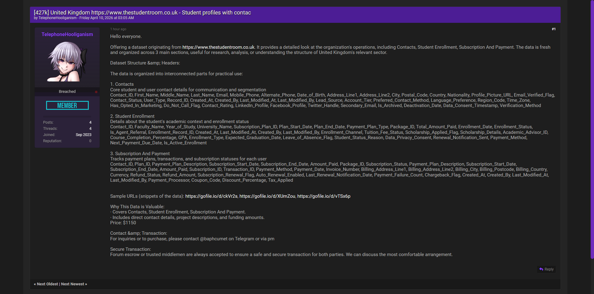 黑客论坛出售英国知名学生社区The Student Room(thestudentroom.co.uk)完整数据库,泄露约42.7万条学生档案及联系信息,数据分为联系人、学生注册及订阅支付三个主要部分,包含大量姓名、联系方式、大学就读详情及支付记录等敏感信息。