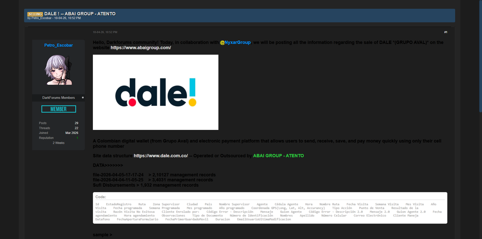 黑客论坛出售哥伦比亚DALE数字钱包(Grupo Aval旗下,由ABAI Group - Atento运营)完整管理数据库,包含数万条运营记录,包括主管、代理人、客户拜访、路线规划及支付相关管理数据。