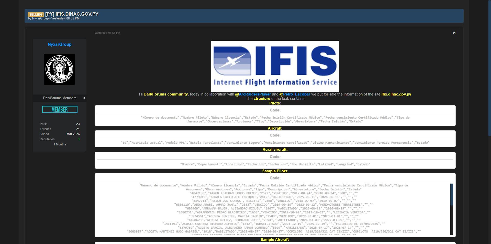 零零信安暗网新闻 | 巴拉圭民航局IFIS飞行员与飞机数据库泄露