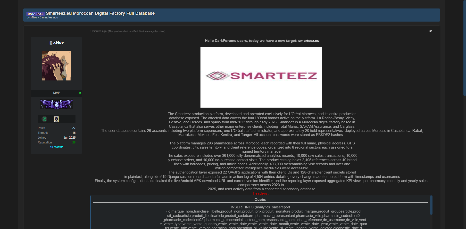 黑客论坛上曝光了摩洛哥Smarteez.eu数字工厂平台的完整数据库,该平台专为L’Oréal摩洛哥服务,涵盖La Roche-Posay、Vichy、CeraVe、Dercos等四大品牌,包含296家药店的管理数据、36.1万条分析记录、1万条销售交易、1万条采购订单、40.3万条陈列访问记录以及超100万条竞品情报媒体文件,所有账户密码均为PBKDF2哈希。