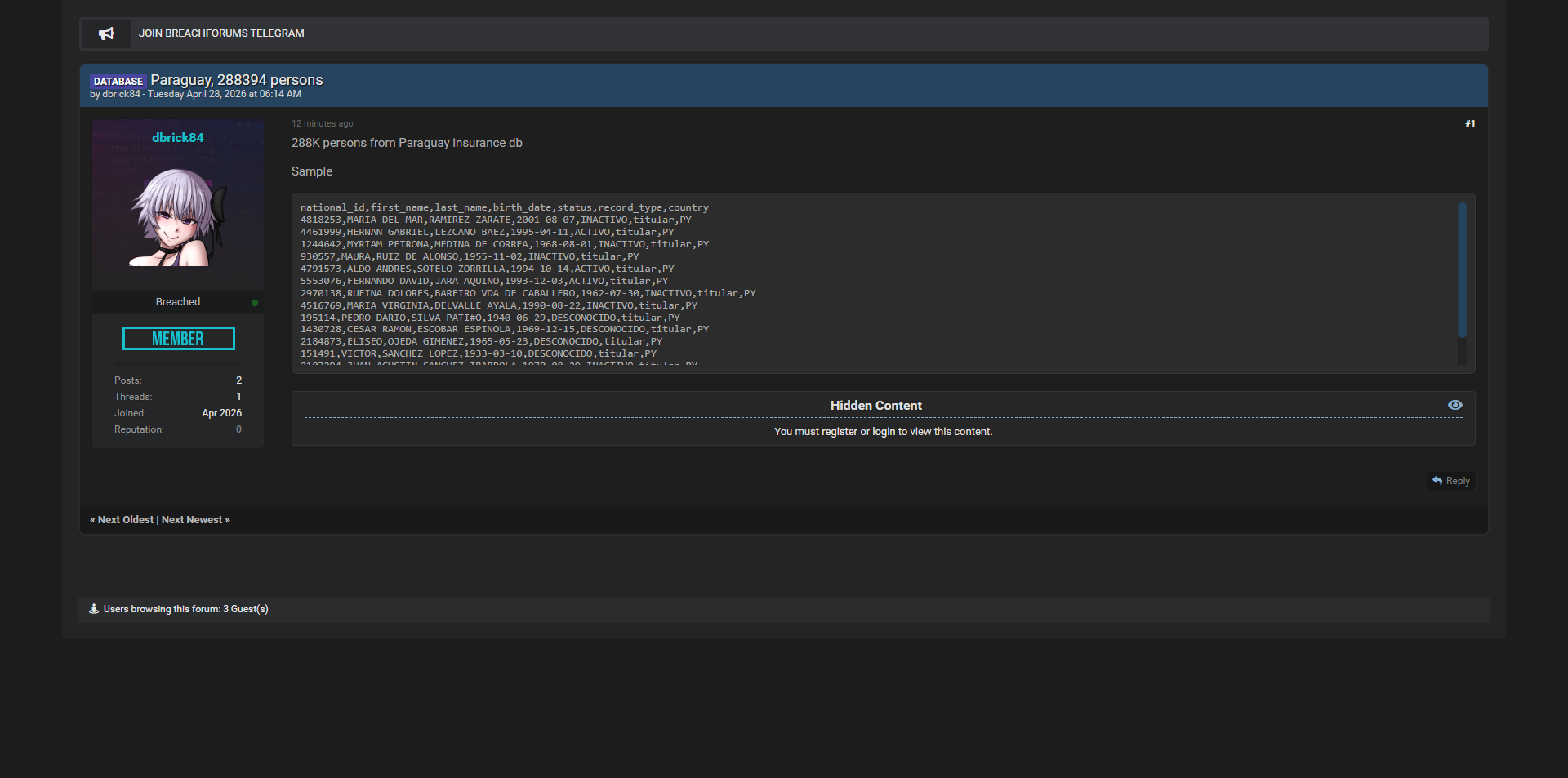 黑客论坛曝光巴拉圭保险数据库,共28.8万条公民记录,泄露了国家ID、姓名、出生日期、状态、记录类型等敏感个人信息。