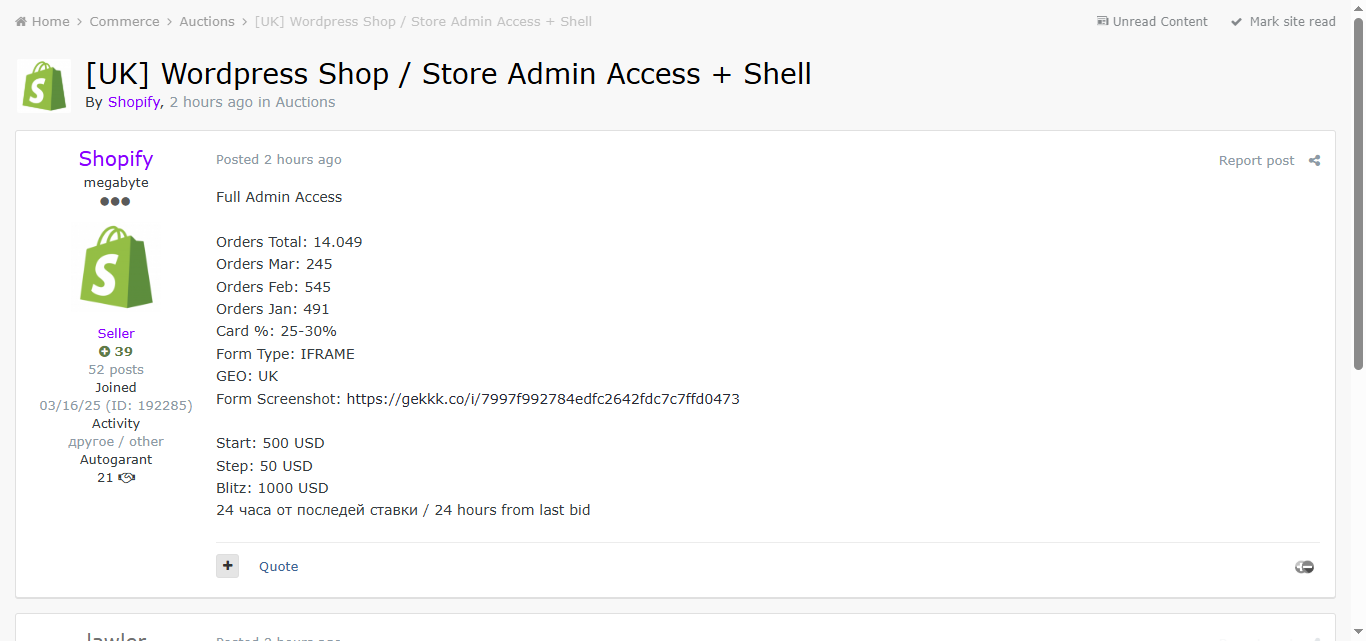 WordPress是一家英国电商网站。威胁行为者在黑客论坛上拍卖该商店的完整管理员访问权限及Web Shell,涉及近3000个订单,所有订单均包含信用卡支付信息。