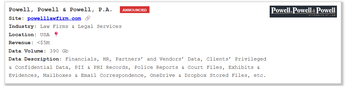 零零信安暗网新闻 | 美国Powell, Powell & Powell律师事务所390GB数据泄露