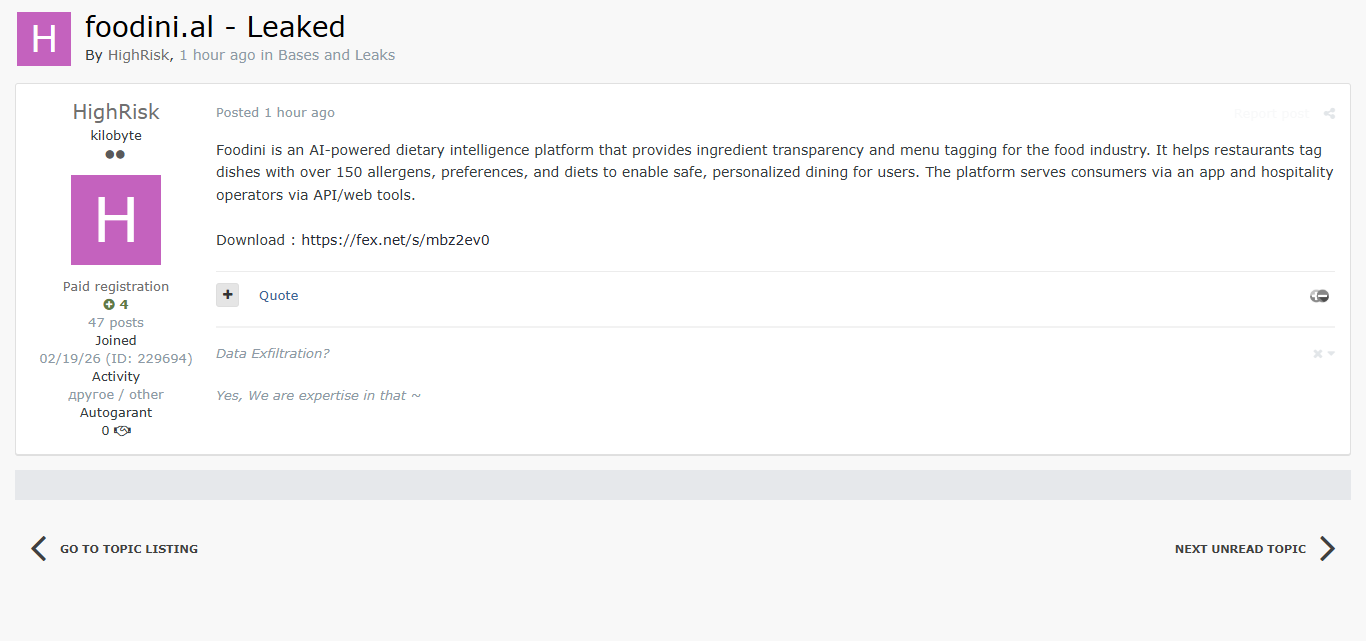 零零信安暗网新闻 | 阿尔巴尼亚AI饮食智能平台Foodini.al数据泄露