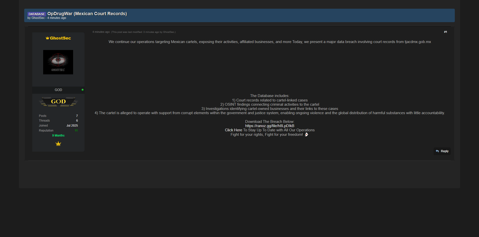 黑客组织GhostSec在暗网论坛发布“OpDrugWar”行动成果,泄露墨西哥法院系统(tjacdmx.gob.mx)大量机密法院记录,重点包含与贩毒集团相关的案件档案、OSINT调查结果、贩毒集团关联企业信息,以及政府和司法系统内腐败分子支持贩毒活动的证据。