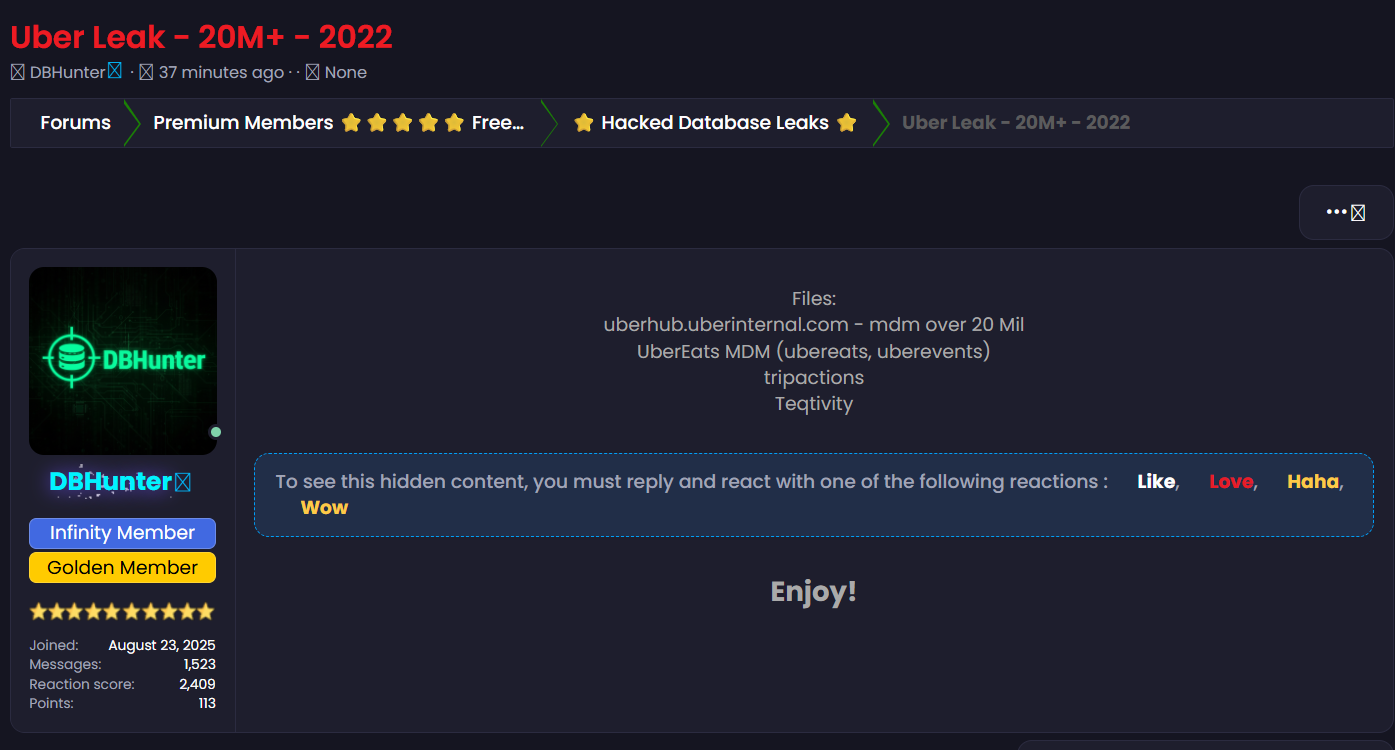黑客DBHunter在论坛上发布了Uber 2022年的数据泄露包,包含uberhub.uberinternal.com MDM系统超过2000万条记录,以及Uber Eats MDM(ubereats、uberevents)、TripActions交易记录、Teqtivity等子平台内部数据。