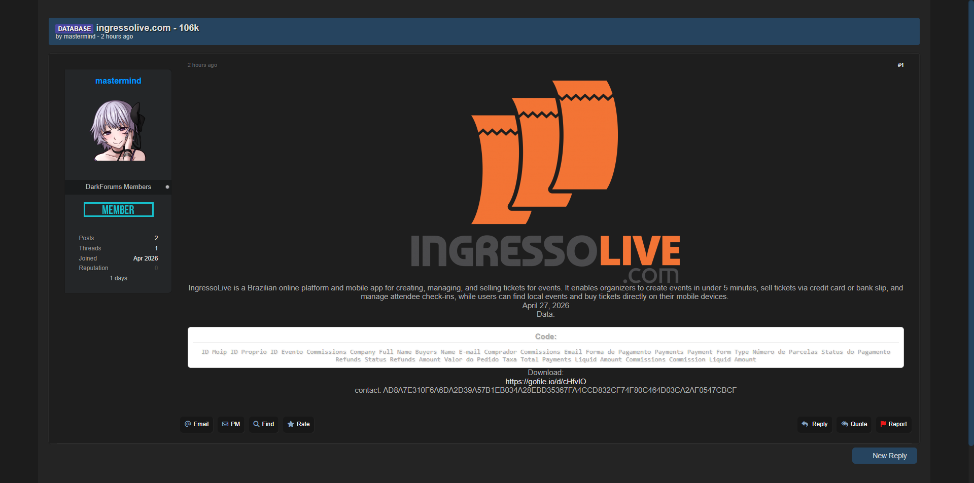 黑客论坛曝光巴西事件票务平台IngressoLive.com完整数据库,共10.6万条记录,泄露了用户ID、姓名、邮箱、支付信息、佣金记录、订单金额、支付状态、税费等敏感数据。