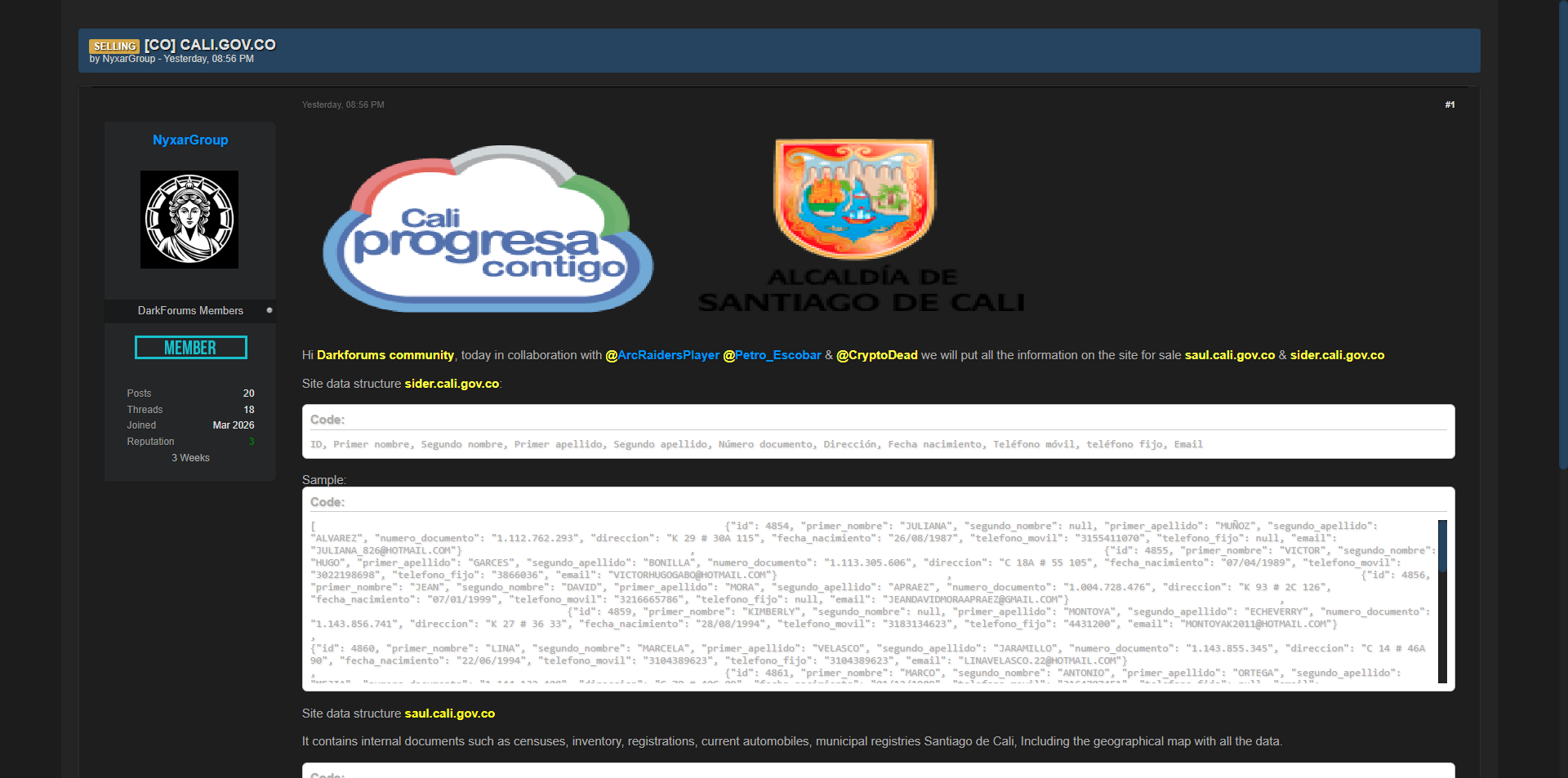 黑客论坛曝光哥伦比亚卡利市(Santiago de Cali)政府官网saul.cali.gov.co和sider.cali.gov.co的完整数据库,包含大量市民个人信息及内部市政文件。