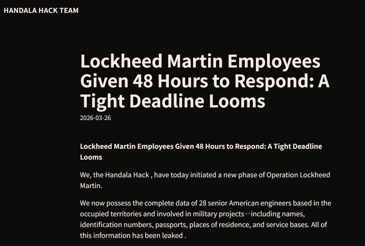 安全提醒: 洛克希德·马丁28名高级工程师的全部个人信息(包括名字、护照、住址、家人资料等)已经被黑客组织Handala Hack Team偷走,并在暗网放了出来。他们威胁48小时内不回应就要全球公开。这件事非常危险,可能会导致身份被冒用、骚扰甚至人身安全出问题。建议相关人员马上加强个人信息监控,别理任何暗网勒索,尽快向警方或公司报告,并做好防护措施,尽量减少损失。