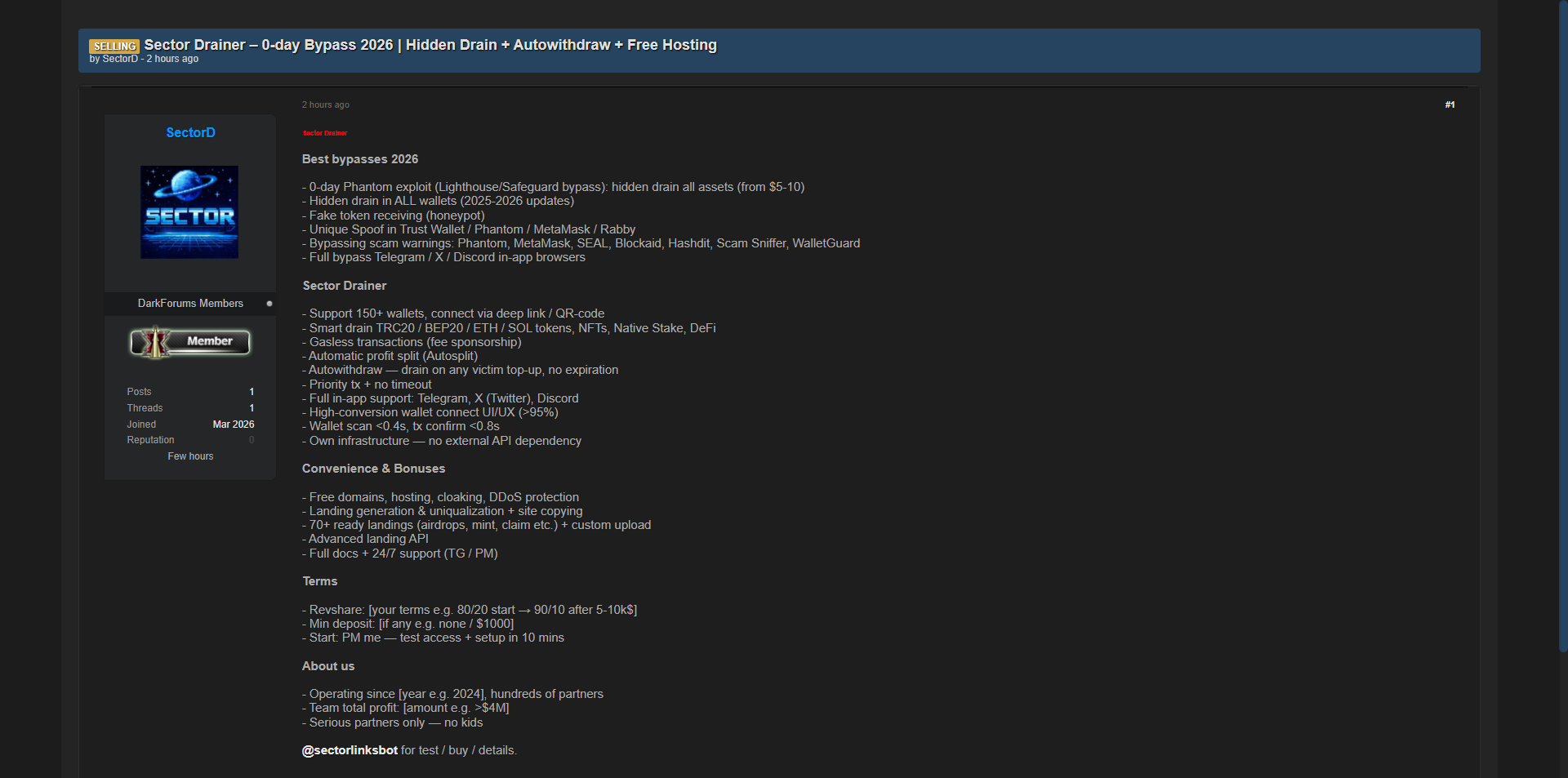 威胁行为者在黑客论坛上发布帖子,推广一款名为“SectorDrainer”的加密货币盗窃工具。