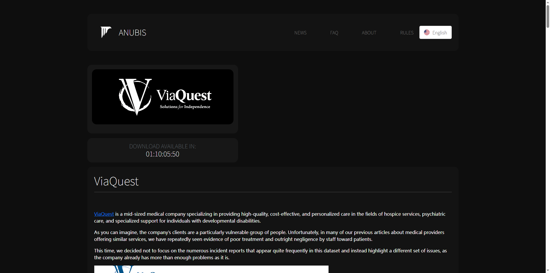 暗网泄露平台Anubis曝光美国ViaQuest医疗公司完整数据。该公司是一家专注于临终关怀服务、精神护理以及发育障碍人士专业支持的中型医疗机构,其客户群体为高度脆弱人群。