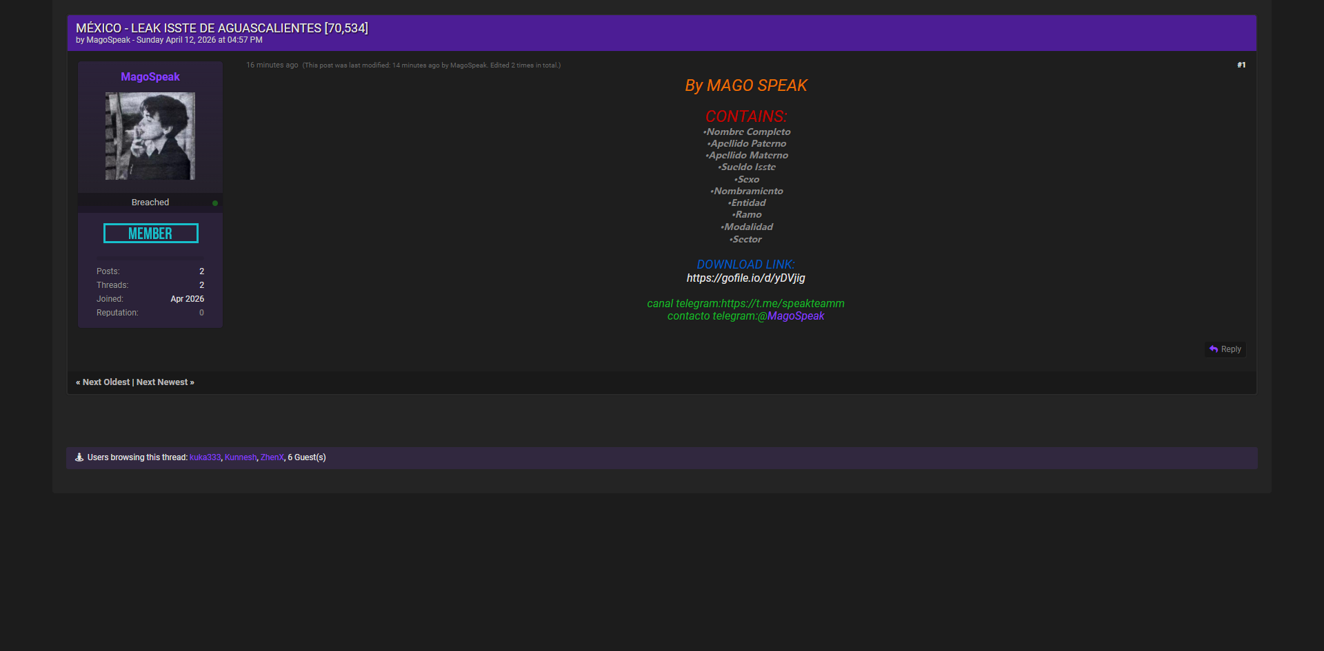 黑客论坛曝光墨西哥阿瓜斯卡连特斯州ISSTE(国家职工社会保障与服务研究所)数据库,泄露约70,534条职工及受益人完整记录,包含大量公务员及家属的个人信息、任职资料和社保相关信息。