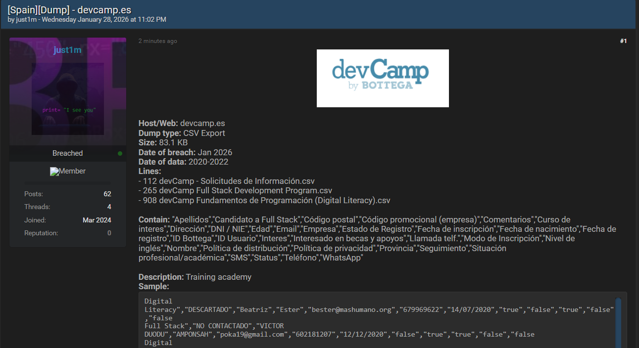 西班牙科技与编程集训营专业培训机构 devCamp 据称遭遇数据泄露。该事件于 2026 年 1 月泄露在暗网中,泄露内容为多份数据库导出文件,其中包含全栈开发、数字素养等各类培训项目的申请者及在册学员信息,泄露数据的记录时间跨度覆盖 2020 年至 2022 年。