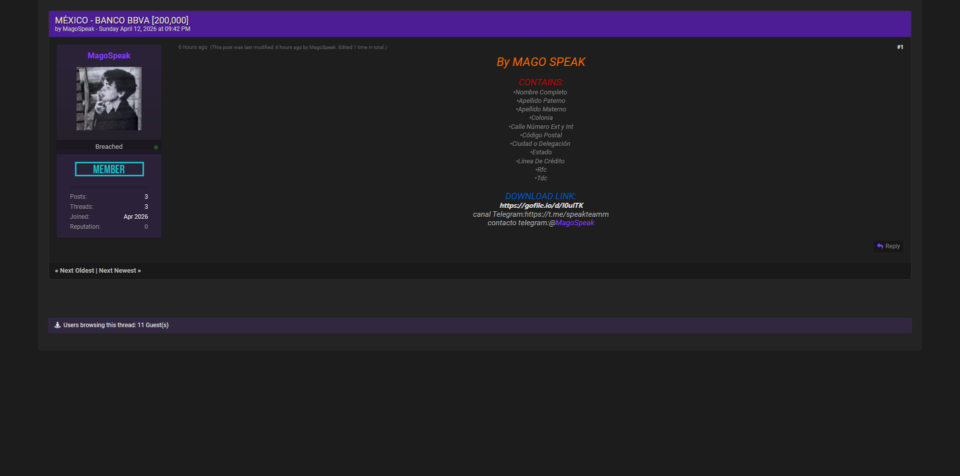 黑客论坛曝光墨西哥BBVA银行数据库,泄露约20万客户完整个人信息及信贷资料,包含姓名、详细地址、邮政编码、RFC税号、信用额度等银行敏感信息。